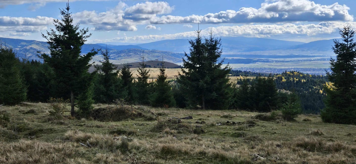 A kis pihenő után tovább kapaszkodunk felfelé. Körülbelül 1,1 km után a kék sáv turistajelzést fogjuk követni, és nemsokára felérünk a Benevesze-tisztásra (1173 m). Idáig már 7,5 km-t tettünk meg. Lélegzetelállító kilátás nyílik innen a Gyergyói-medencére és a környező hegyekre.